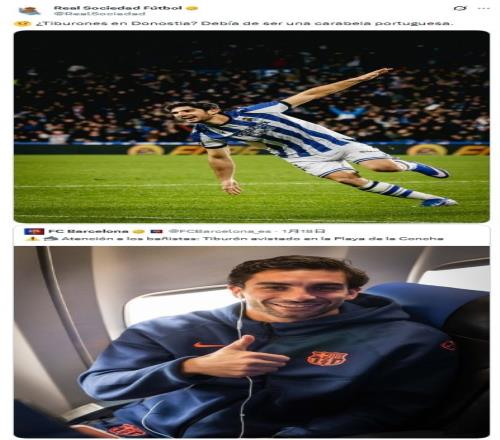 葡萄牙球员格德斯此役传射建功,帮助皇家社会取胜,赛后皇家社会晒出格德斯的照片,回复巴萨:“圣塞瓦斯蒂安出现鲨鱼? 那肯定是一只葡萄牙战舰水母。”