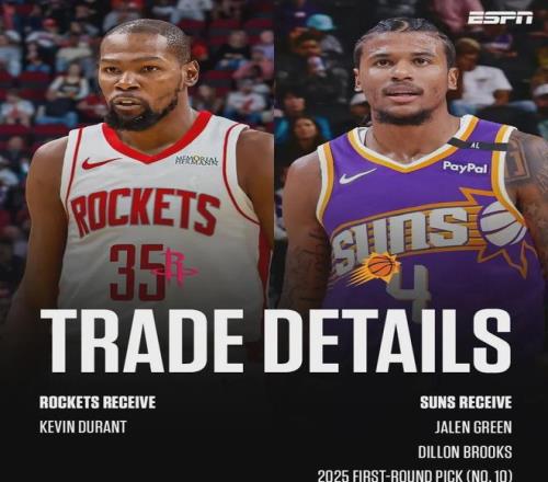 去年休赛期,火箭为了得到杜兰特,将杰伦格林+狄龙+25年首轮第十号签+5个次轮签送至太阳。
